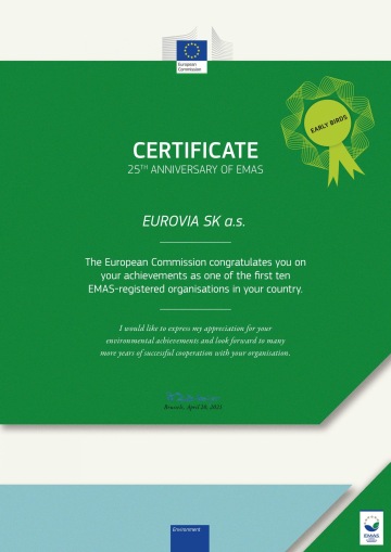 Európska komisia blahoželá spoločnosti EUROVIA SK k jej environmentálnym úspechom, ako jednej z prvých a najdlhšie registrovaných organizácii v EMAS na Slovensku.
