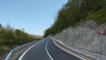 Zárez, teda svah nad komunikáciou sa zastabilizoval vystuženým striekaným betónom a zemnými klincami. Aby sa zamedzilo vsakovaniu zrážkových vôd do podložia cestného telesa, priekopa sa vydláždila betónovými tvarovkami.